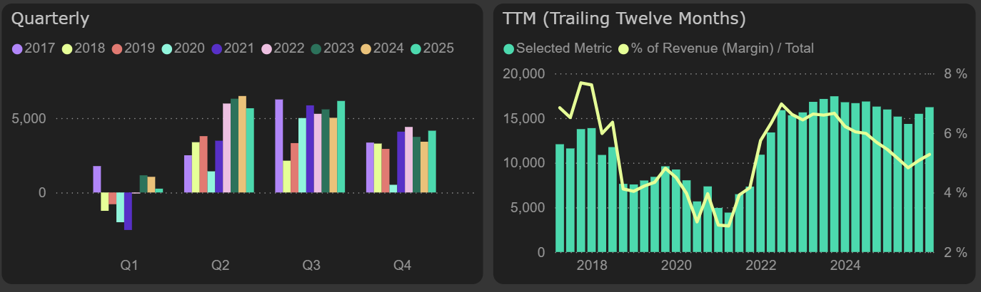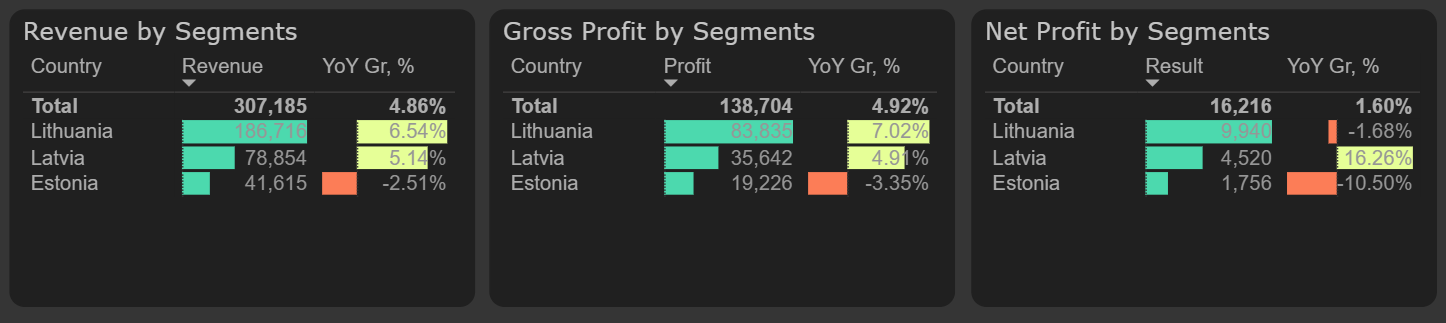 Revenue grew at a moderate pace in the last quarter of 2025 – by 3% compared to the previous year. The strongest revenue growth was recorded in the third quarter – 11% YoY, while overall revenue for 2025 increased by 5% compared to 2024. Both in the last quarter and throughout 2025, turnover increased in Lithuania and Latvia.