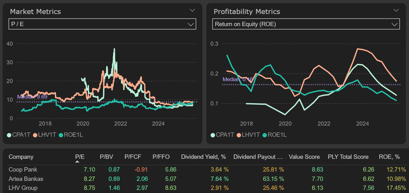 After the third quarter results, Coop Pank still holds the lowest valuation metrics (P/E, P/BV) and outperforms Artea in ROE. As before, LHV Group has the highest P/E and P/BV ratios, but this is balanced by a significantly higher ROE.